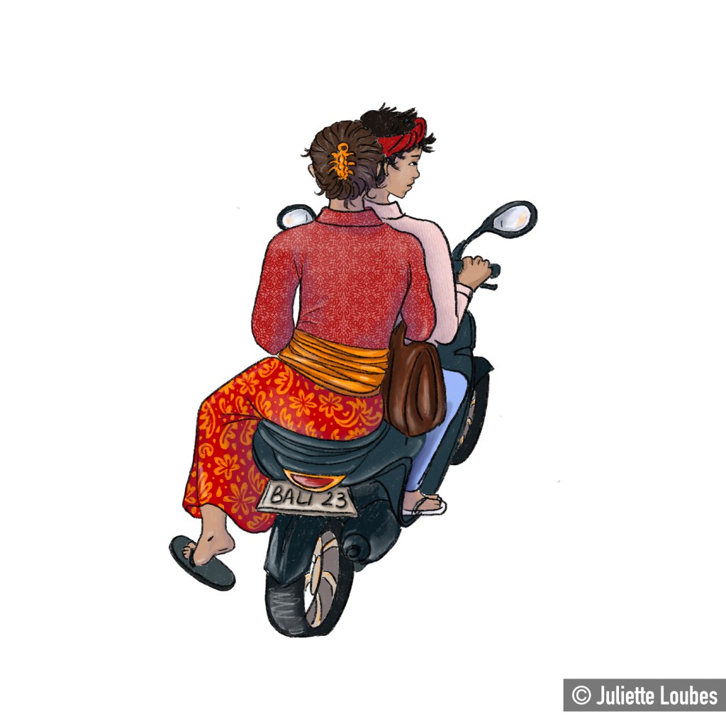 Sur l’île de Bali, les deux-roues sont rois. Impossible de se déplacer autrement, n’en déplaise aux vélos, trottinettes ou autres extravagances piétonnières.